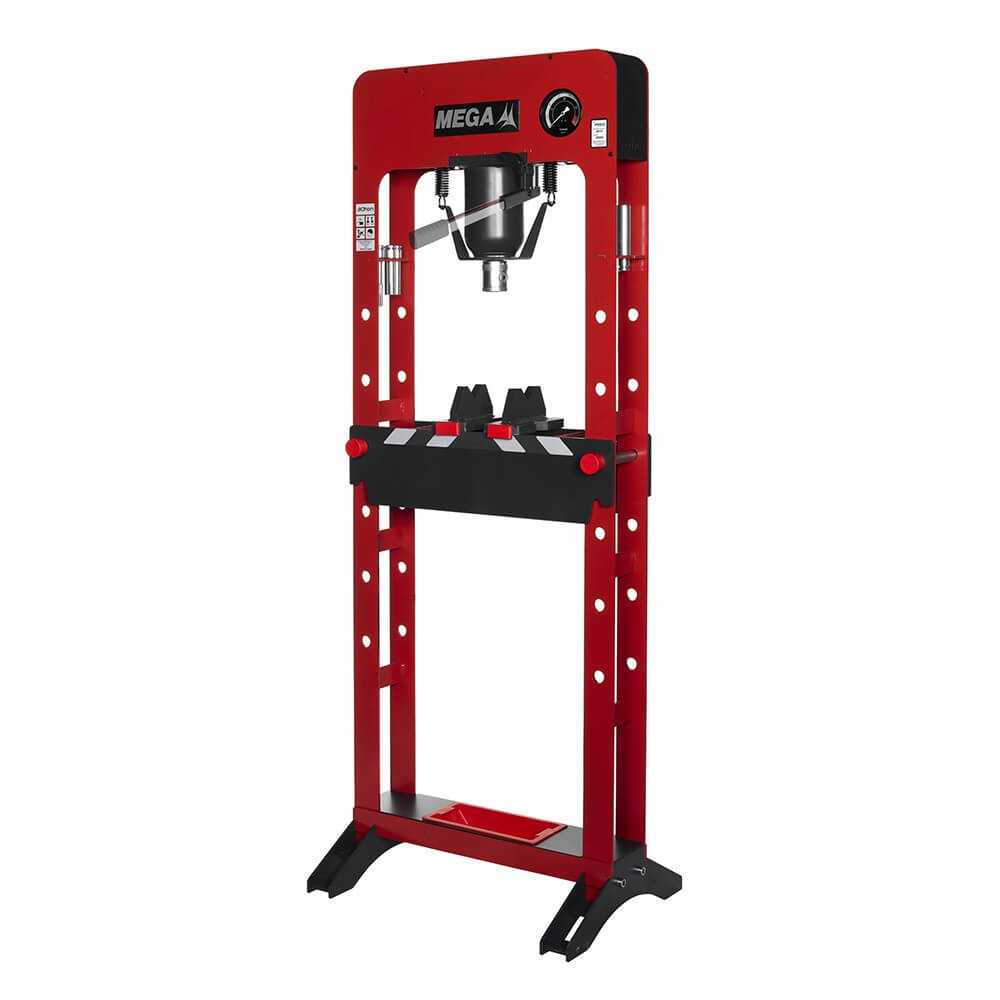 Prensa Hidráulica de 30 Toneladas, fabricada en acero de alta resistencia con bomba manual monoblock, con un diseño compacto y funcional que integra todos los elementos hidráulicos dentro del chasis, protegiéndolos y ahorrando espacio en el taller y en el trasporte. Se suministran con pies de transporte desechables y listas para trabajar. Mesa de trabajo ajustable en distintas alturas. Incluyen 2 apoyos en V con guía de sujeción y orificio de extracción